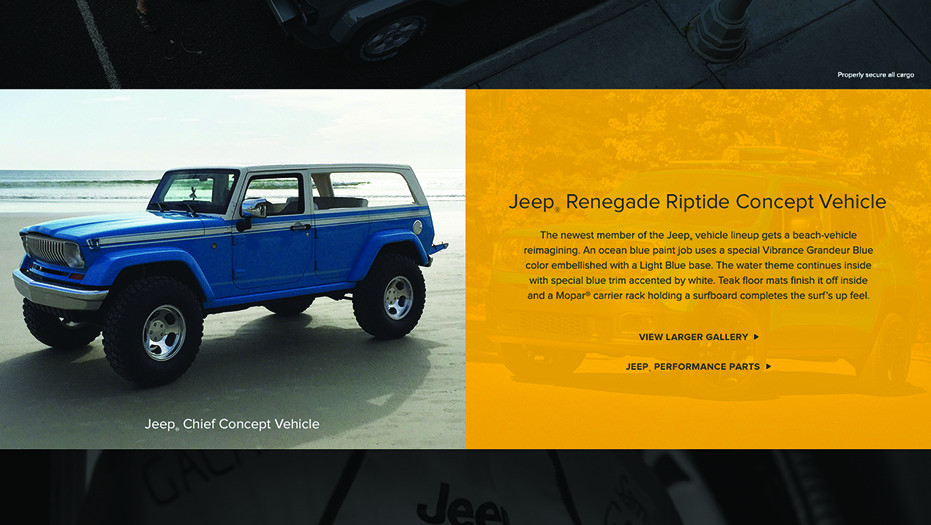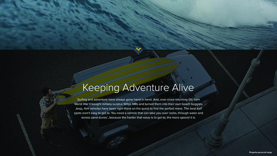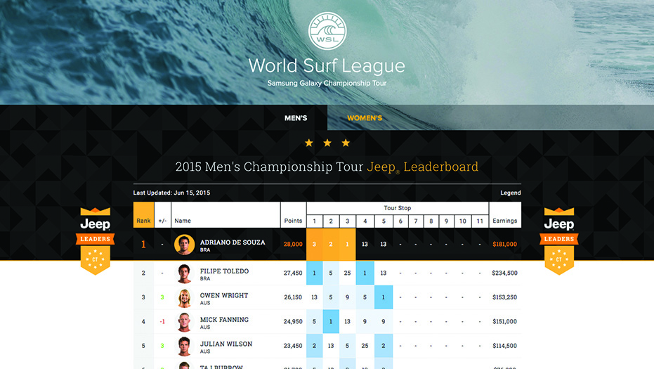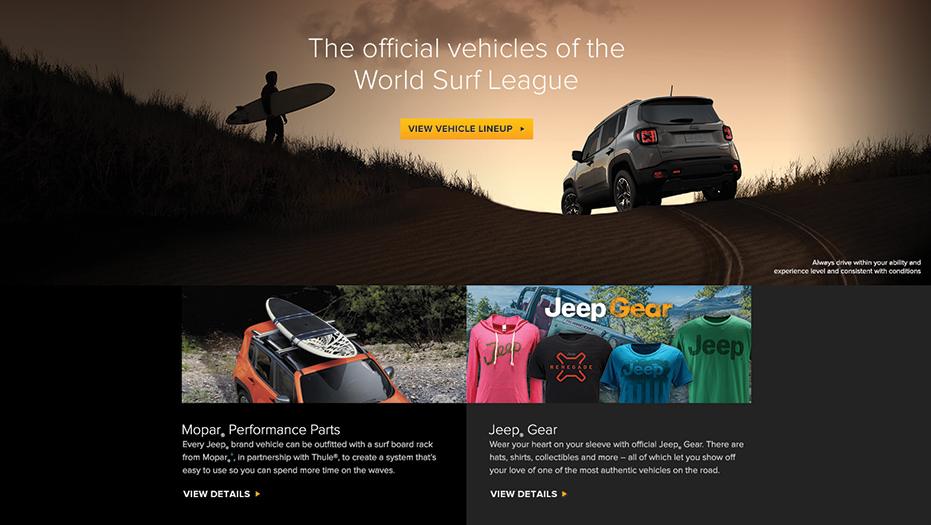 Jeep and surfing go together like PB and J. So when the brand started a collaboration with the world’s foremost pro surfing organization we knew we had to take advantage. On the site, users were immediately immersed into the essence of the sport with a series of full screen videos. Surf-themed vehicles were highlighted and a constantly updated WSL leaderboard further linked Jeep with WSL.