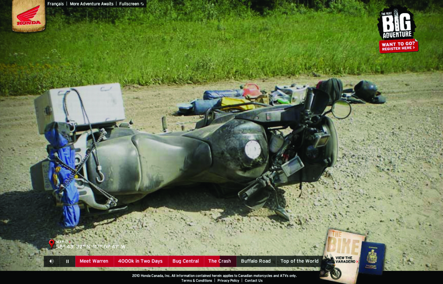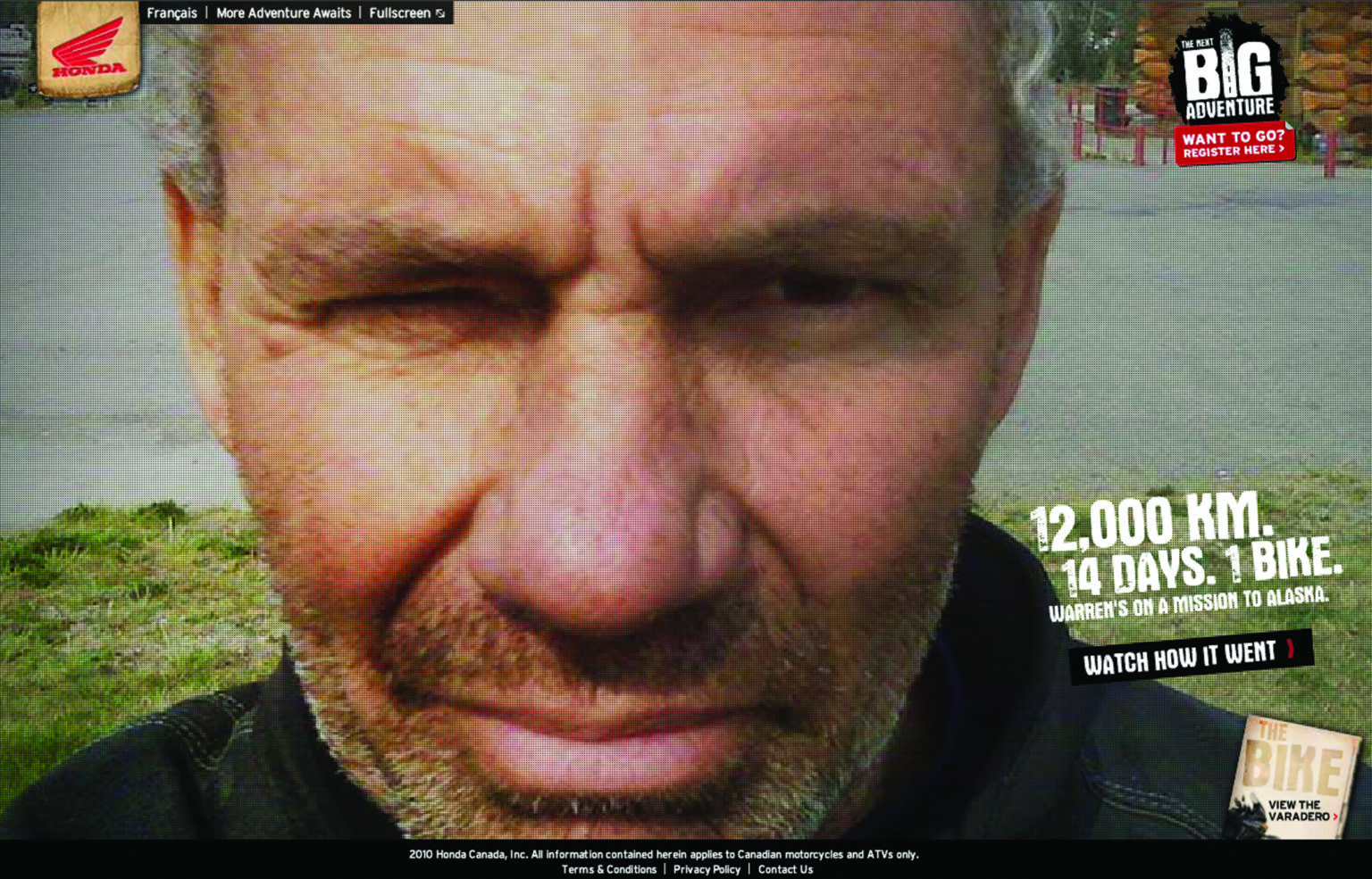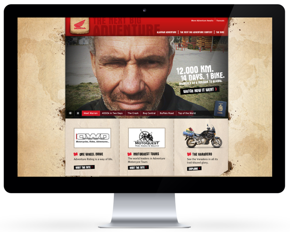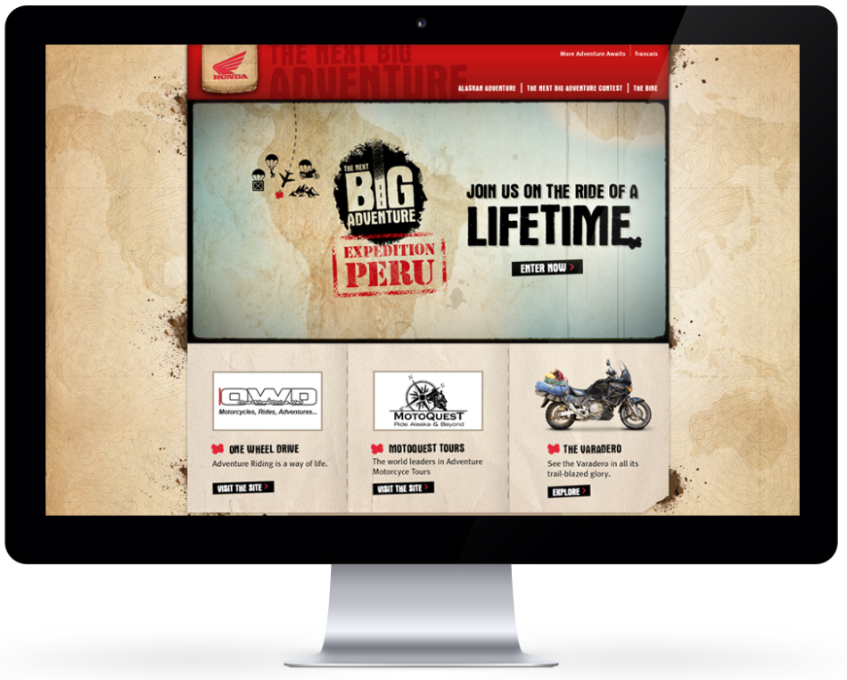 Adventure motorcycling is not for the faint of heart. Just you and whatever you can load on the back of your bike… a kind of weird offspring between a big tourer, and a nimble motocross. They're built to go just about anywhere and to satisfy whatever bout of wanderlust has stricken you. We thought that the best way to demonstrate this wild world was to show it. We built a microsite where users could track along with Honda Canada's Warren Milner on each stage of 2 week, 12,000 km journey from Toronto to Alaska. We followed that up with a contest where fellow adventure addicts could win a trip to Peru to see Machu Picchu from the seat of a Honda bike.