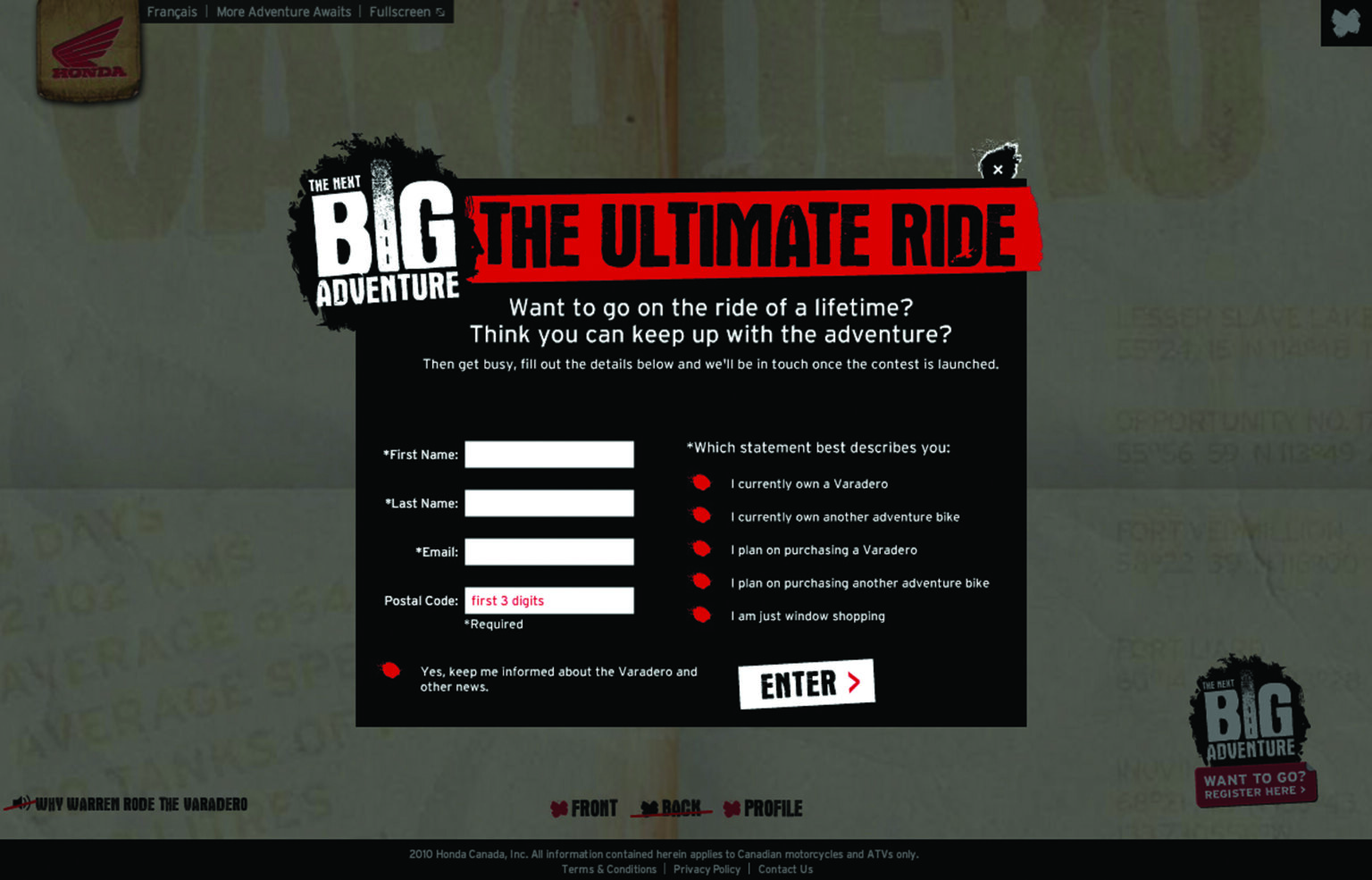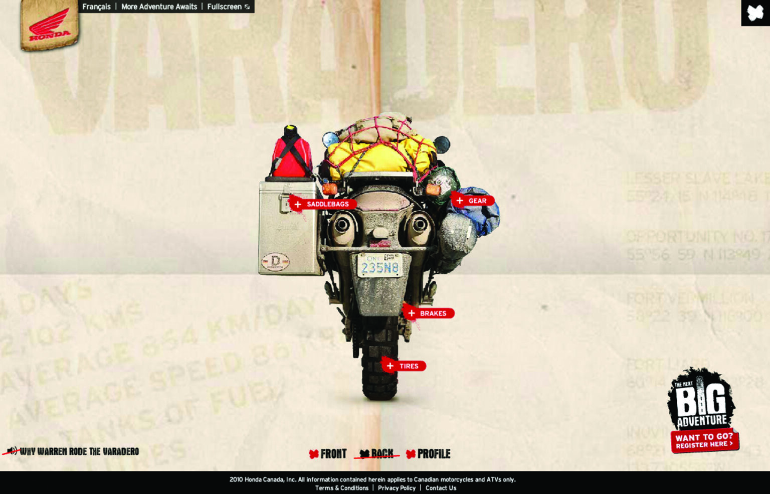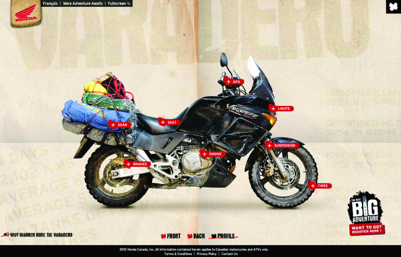 Adventure motorcycling is not for the faint of heart. Just you and whatever you can load on the back of your bike… a kind of weird offspring between a big tourer, and a nimble motocross. They're built to go just about anywhere and to satisfy whatever bout of wanderlust has stricken you. We thought that the best way to demonstrate this wild world was to show it. We built a microsite where users could track along with Honda Canada's Warren Milner on each stage of 2 week, 12,000 km journey from Toronto to Alaska. We followed that up with a contest where fellow adventure addicts could win a trip to Peru to see Machu Picchu from the seat of a Honda bike.
